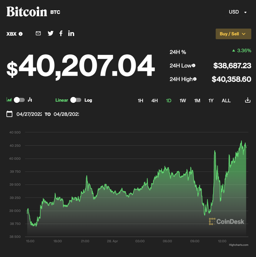 Tính đến thời điểm viết bài, tiền điện tử lớn nhất theo giá trị thị trường đã tăng 3,2% trong 24 giờ qua, đổi chủ ở mức 40,206 đô la.