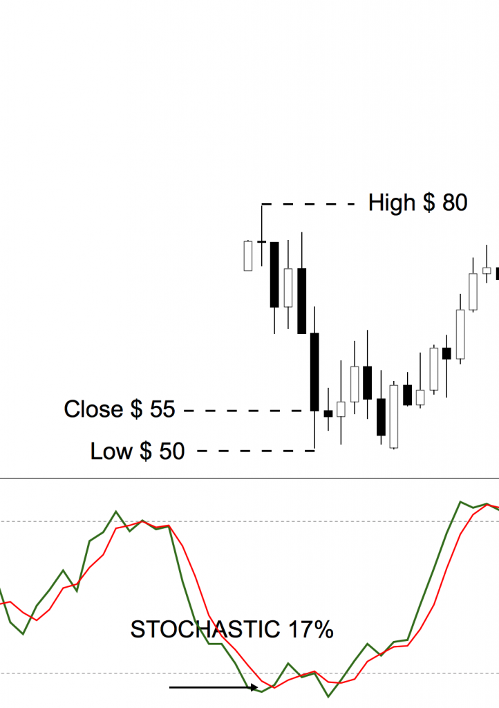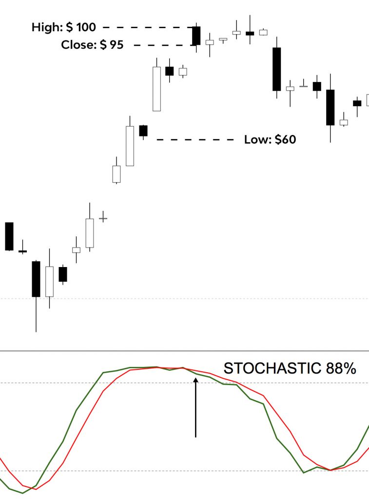 Hình ảnh cho thấy mức thấp nhất là 60 đô la, mức cao nhất là 100 đô la (phạm vi 40 đô la) và giá đóng cửa gần như ở mức cao nhất ở mức 95 đô la. Stochastic hiển thị 88%, có nghĩa là giá chỉ đóng cửa 12% (100% – 88%) so với đỉnh tuyệt đối.