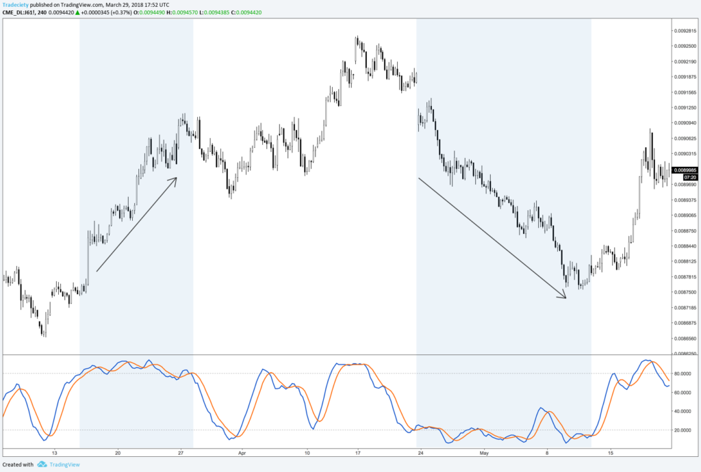 Hình ảnh dưới đây cho thấy hành vi của Stochastic trong một xu hướng tăng dài và một xu hướng giảm. Trong cả hai trường hợp, Stochastic đã đi vào “quá mua” (trên 80), “quá bán” (dưới 20) và ở đó trong một thời gian khá dài, trong khi xu hướng vẫn tiếp tục. Một lần nữa, niềm tin rằng Stochastic cho thấy quá bán / quá mua là sai và bạn sẽ nhanh chóng gặp vấn đề khi giao dịch theo cách này. Giá trị Stochastic cao cho thấy rằng xu hướng có động lượng mạnh và KHÔNG phải là nó đang bị mua quá mức.
