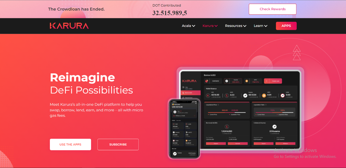 - Karura DEX: AMM DEX hỗ trợ giao dịch cross-chain; anh em có thể cung cấp thanh khoản trên sàn giao dịch này và thu phí từ Karura Swap hoặc được nhận khoản chia sẻ lợi nhuận từ phí bình ổn của stablecoin kUSD.