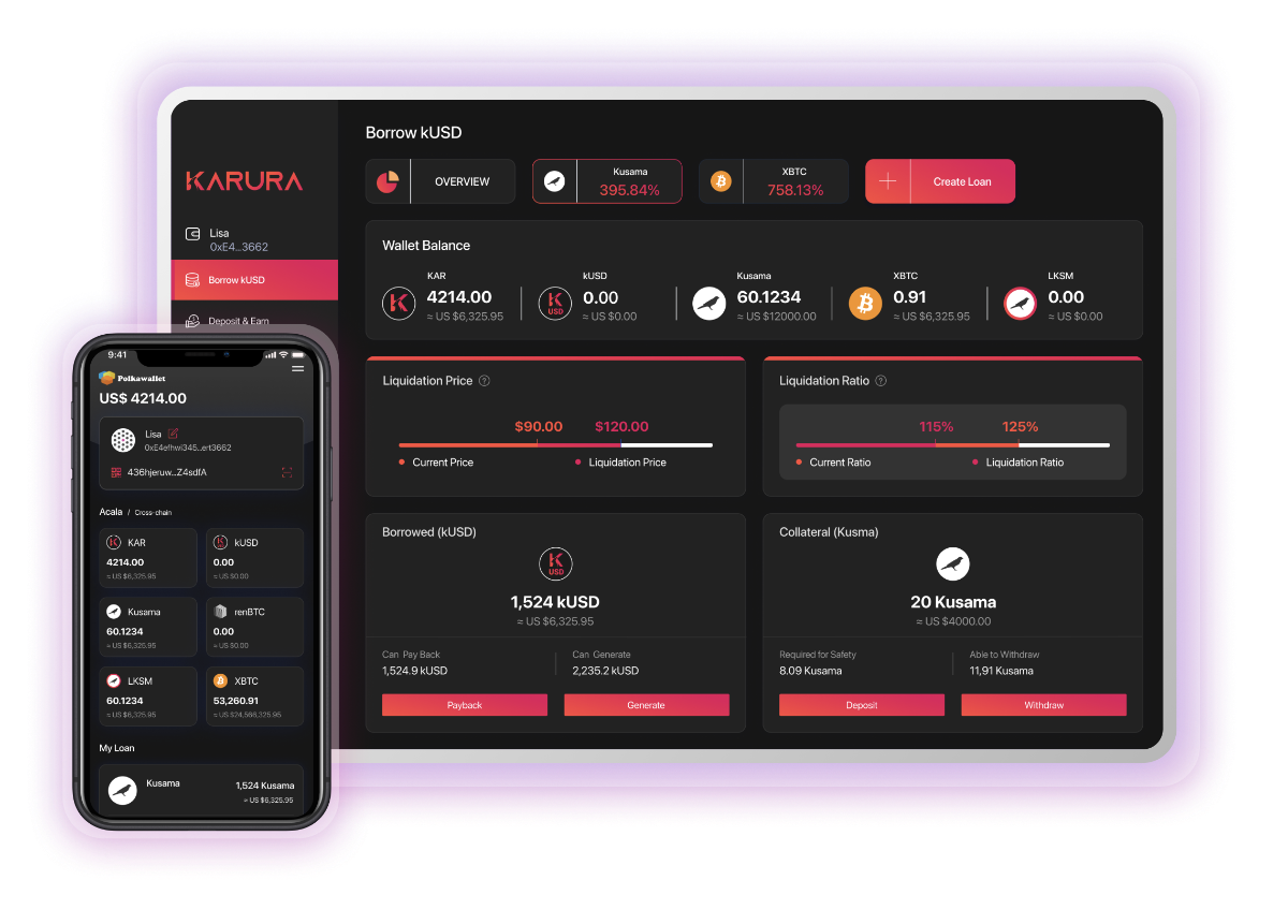 - Karura Dollar (kUSD) stablecoin: Karura Dollar là một stablecoin phi tập trung và đa thế chấp (multi-collateralized) duy trì tỷ giá 1 : 1 đối với giá trị của USD. Nhờ phát hành stablecoin trên chính nền tảng của mình mà Karura giúp người dùng loại bỏ các bước trung gian như chuyển tài sản lên sàn giao dịch tập trung để có thể swap KSM sang loại tiền tệ mình mong muốn.