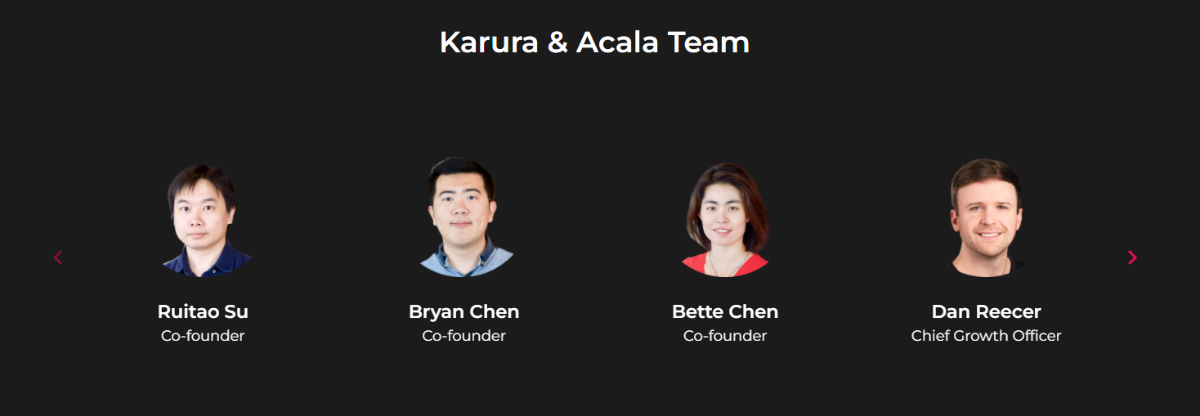 - Ruitao Su: Co-founder của Acala và đang nắm giữ chức vụ CEO của Laminar Protocol. Trước đó, anh này là CTO của Centrality và đã có nhiều kinh nghiệm trong việc thiết kế phần mềm cũng như đầu tư và khởi nghiệp.
